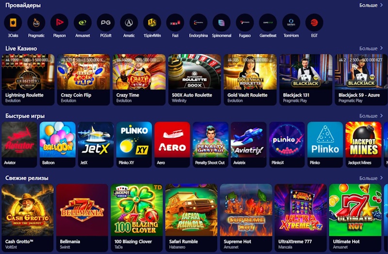 Главная часть сайта организована так, чтобы пользователи быстро находили нужные развлечения. В верхнем горизонтальном меню расположены основные разделы: игровые автоматы, live-казино, виртуальный спорт и акции. Слева находится каталог с провайдерами и тематиками слотов, где можно выбрать классику, фэнтези, приключения или Megaways-механики. В нижней части страницы размещены полезные материалы: правила игры, соглашение пользователя, контакты службы поддержки и ссылки на партнеров.