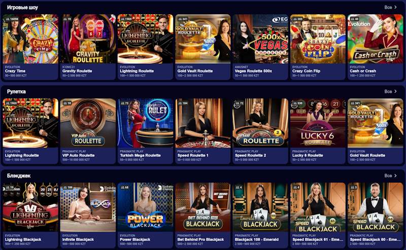 Помимо слотов, пользователям доступны лайв-игры с настоящими крупье: рулетка, блэкджек, покер и игровые шоу. Все трансляции проходят в HD-качестве, а для ставок предусмотрены разные лимиты, что делает формат удобным как для новичков, так и для продвинутых пользователей.
